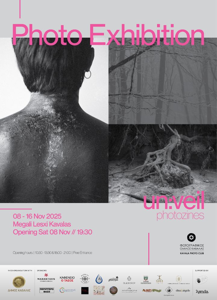 Ο Φωτογραφικός Όμιλος Καβάλας παρουσιάζει έκθεση με τίτλο Un:veil στη Μεγάλη Λέσχη από τις 8 έως τις 16 Νοεμβρίου σε συνδιοργάνωση με τον Δήμο Καβάλας. Η έκθεση περιλαμβάνει φωτογραφίες και χειροποίητα φωτογραφικά βιβλία (zine). Τα έργα ανήκουν σε φωτογραφικά project, που αναπτύχθηκαν από τις ομάδες μελών του ομίλου κατά το τελευταίο έτος και θα παρουσιαστούν συλλογικά υπό την επιμέλεια της Μαριάνθης Ευθυμίου και της Ελένης Μουζακίτη. Από το